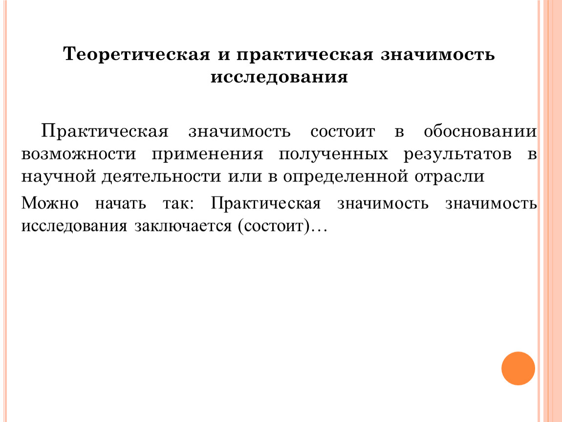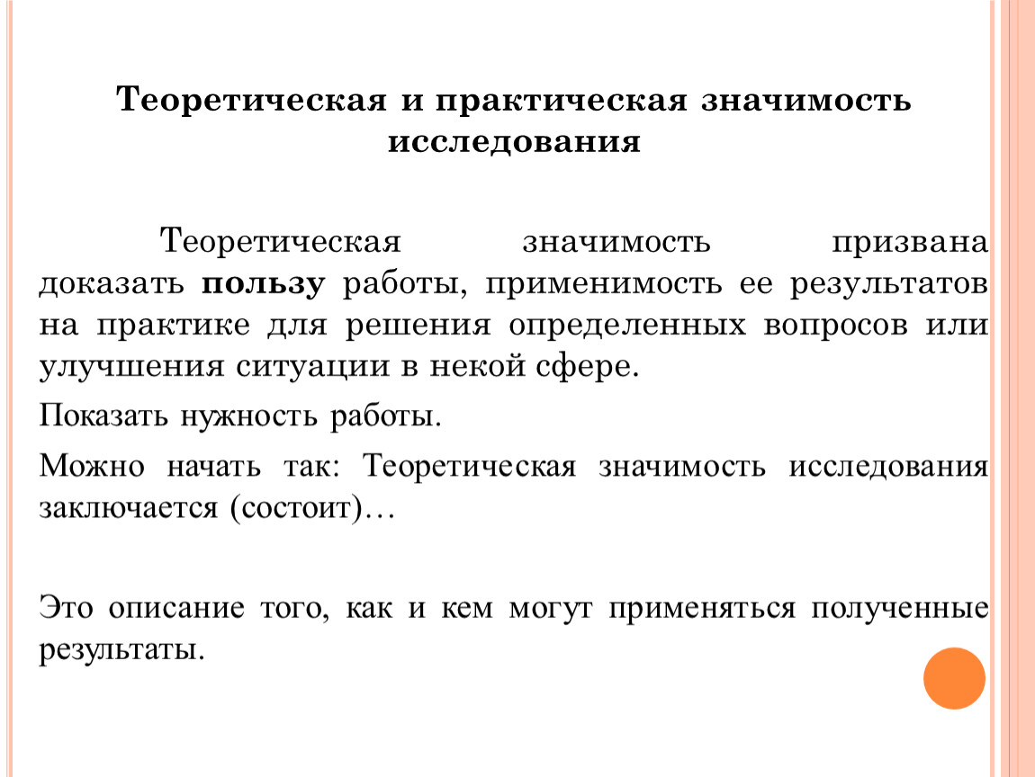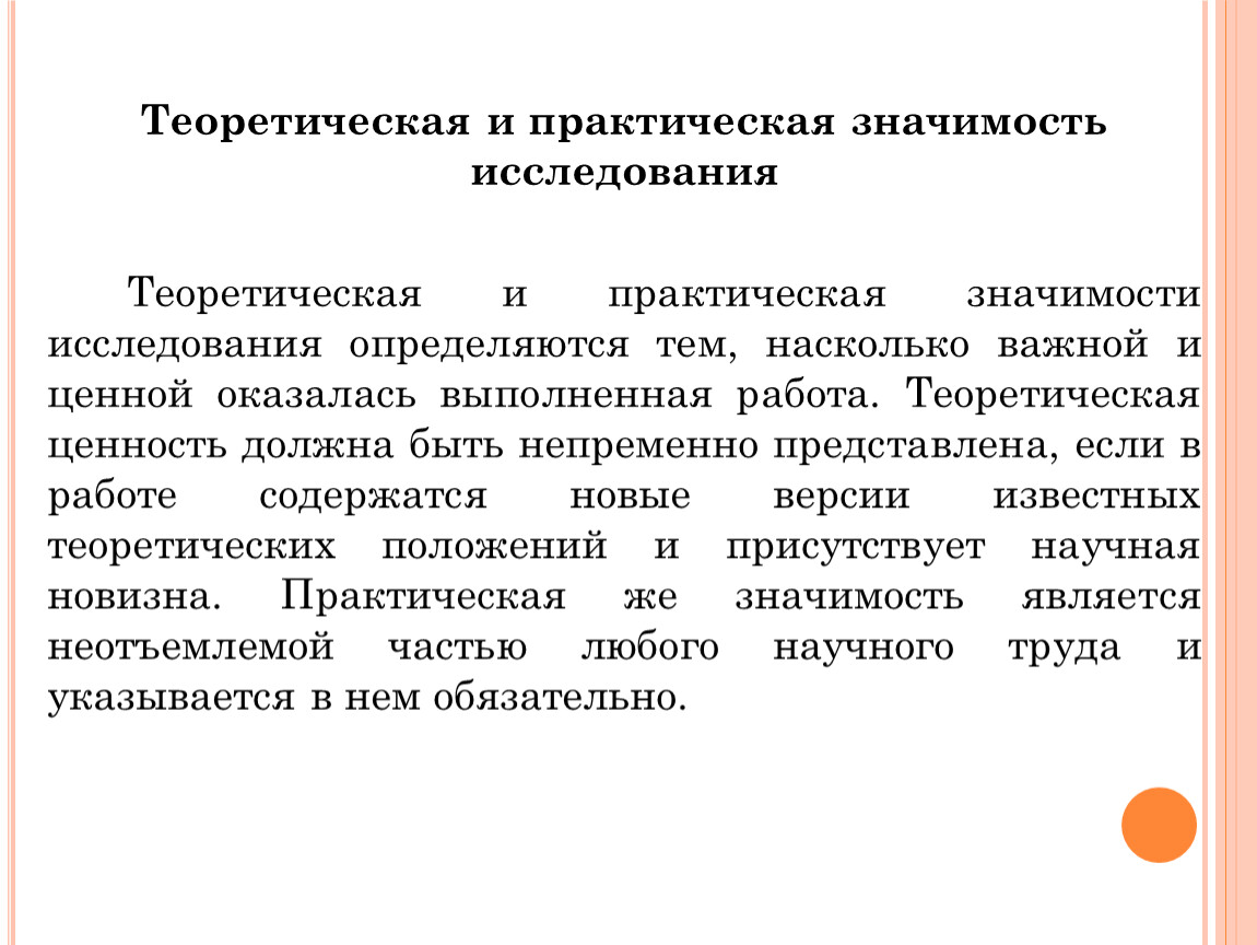 Теоретическая и практическая значимости исследования определяются тем, насколько важной и ценной оказалась выполненная работа. Теоретическая ценность должна быть непременно представлена, если в работе содержатся новые версии известных теоретических положений и присутствует научная новизна. Практическая же значимость является неотъемлемой частью любого научного труда и указывается в нем обязательно.