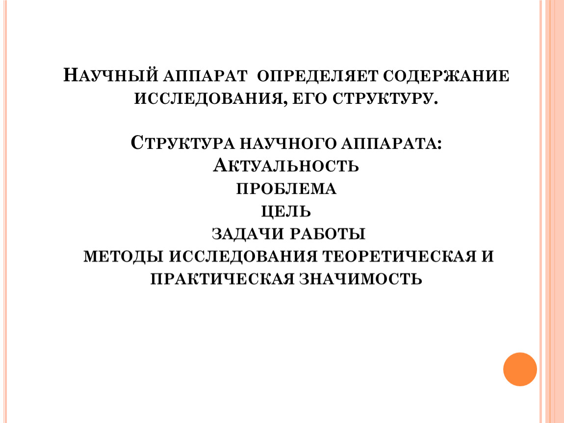 Научный аппарат определяет содержание исследования, его структуру.Структура научного аппарата:Актуальностьпроблемацель задачи работы методы исследования теоретическая и практическая значимость