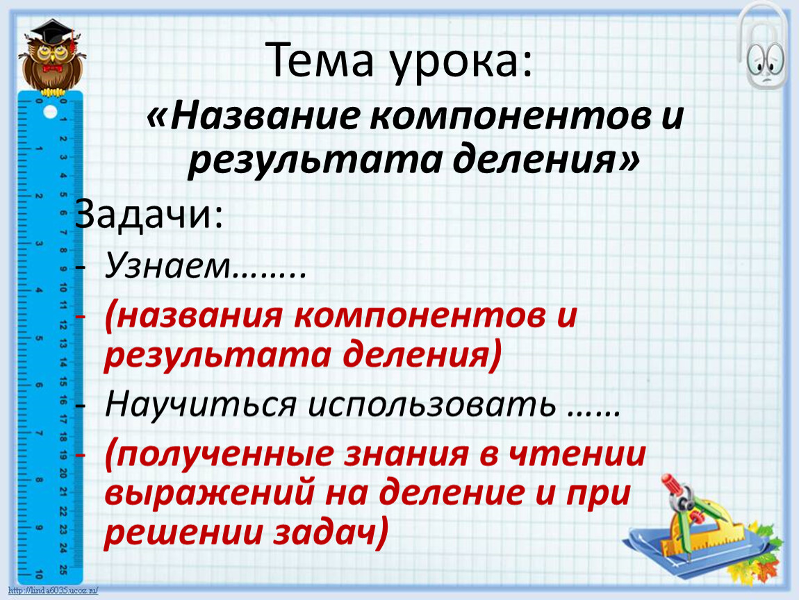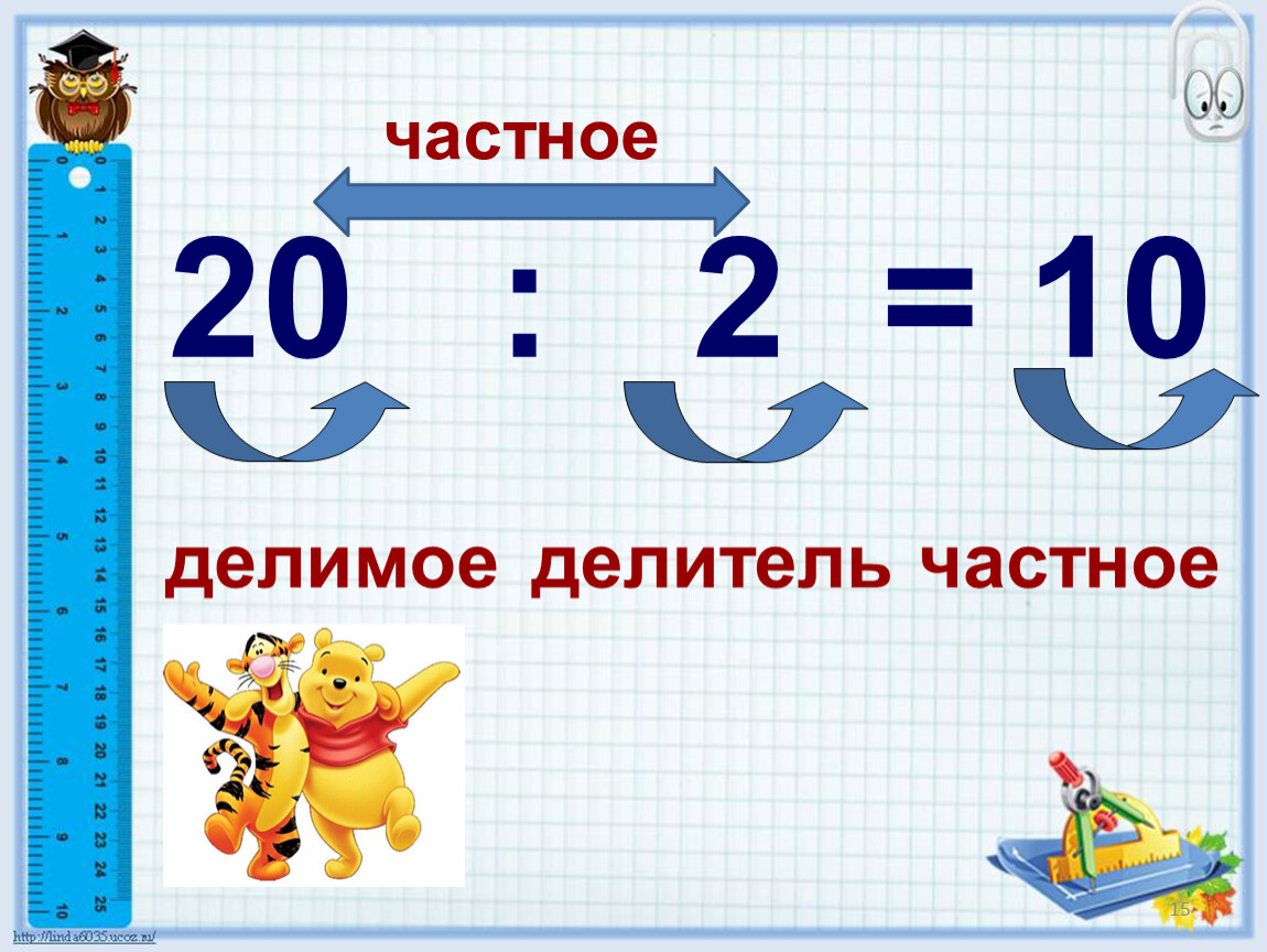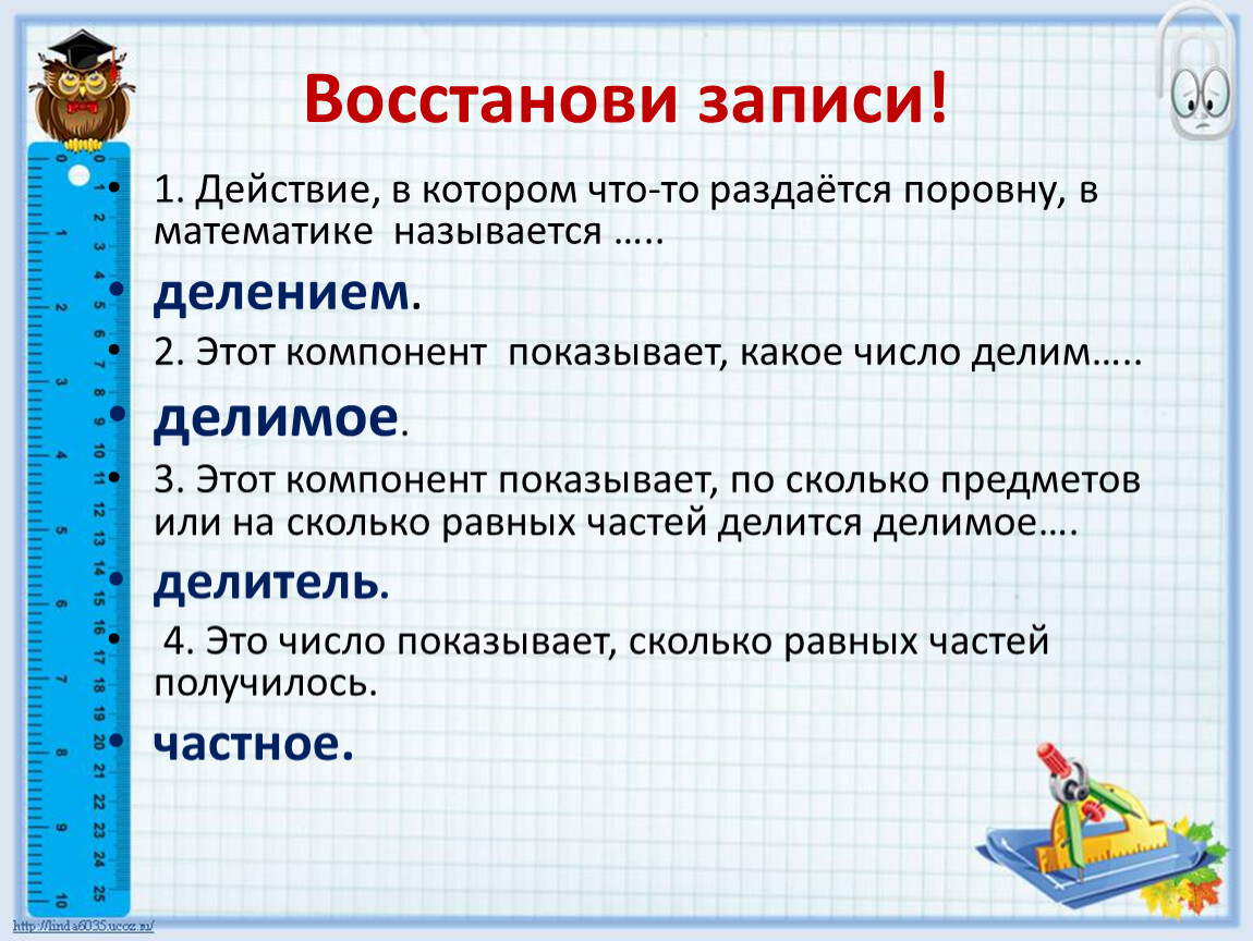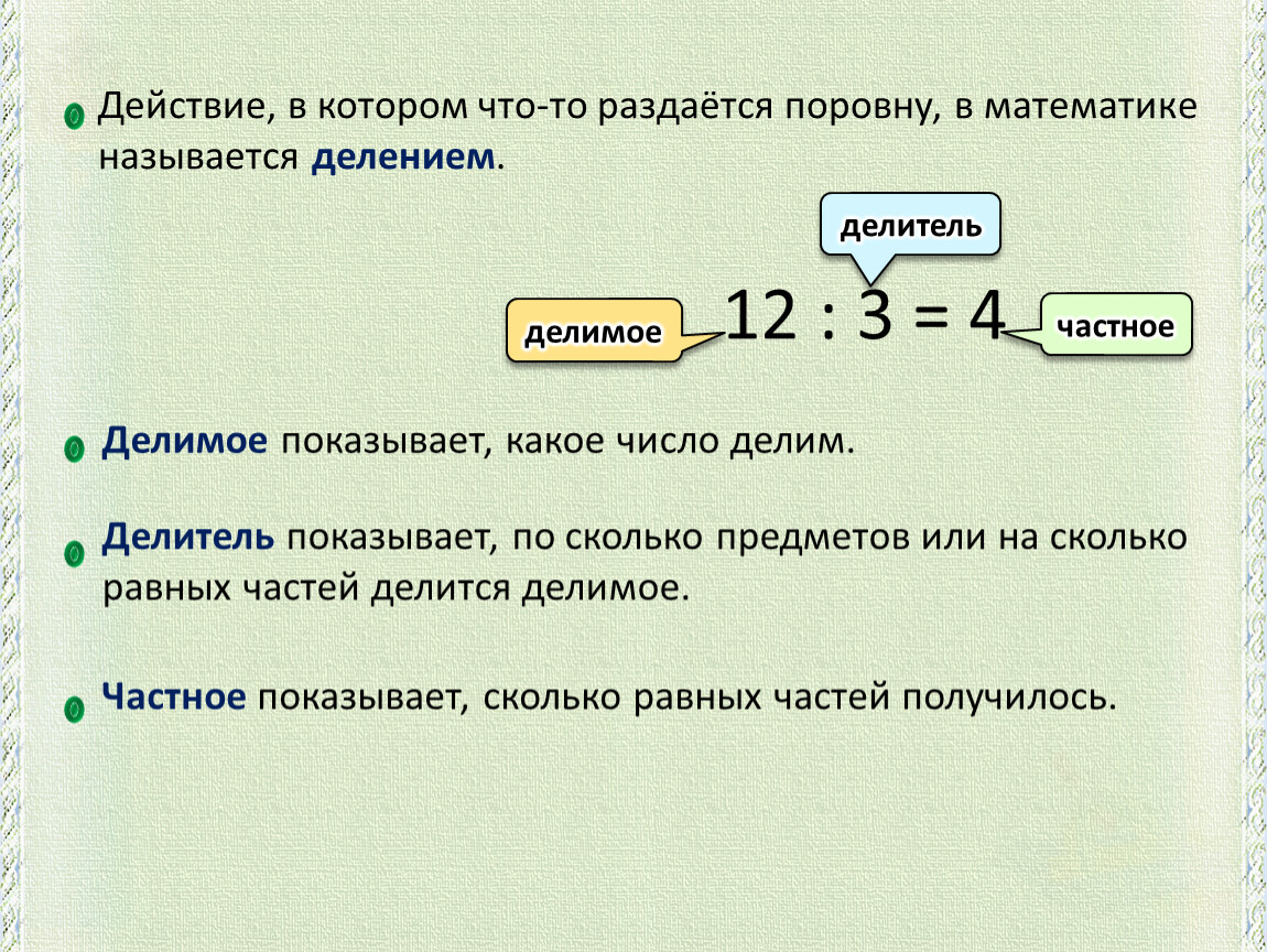 3. Этот компонент показывает, по сколько предметов или на сколько равных частей делится делимое….