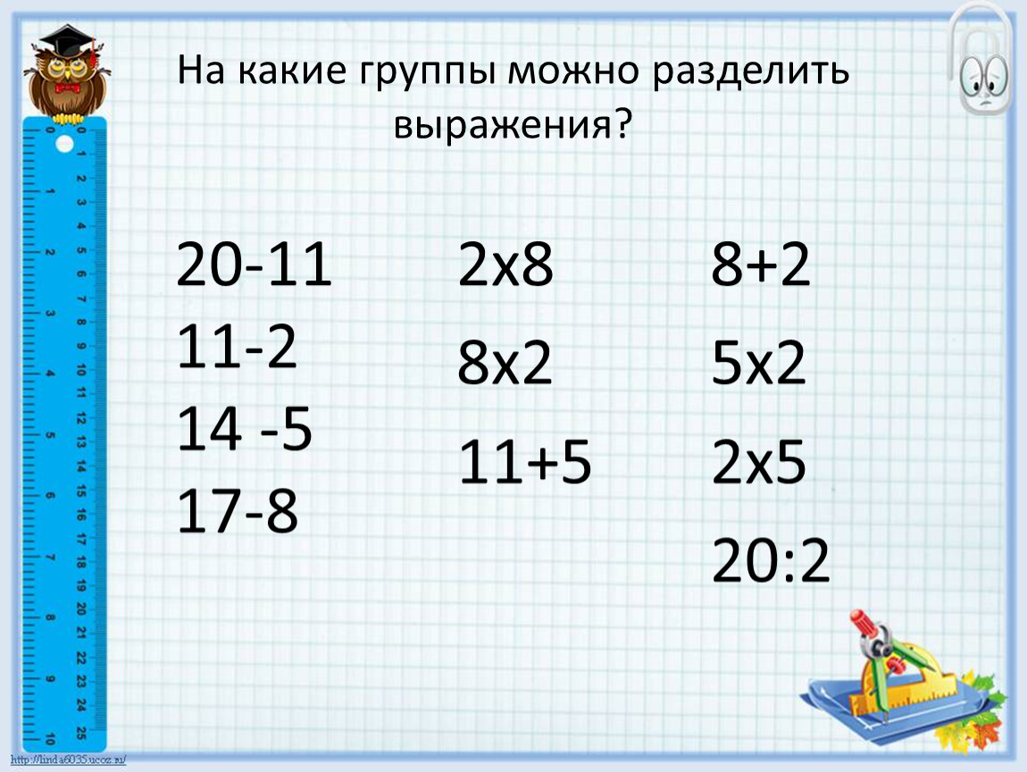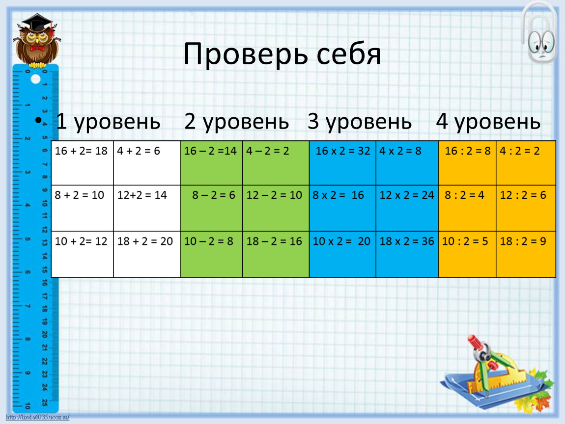 10 + 2= 12 | 18 + 2 = 20 | 10 – 2 = 8 | 18 – 2 = 16 | 10 х 2 = 20 | 18 х 2 = 36 | 10 : 2 = 5 | 18 : 2 = 9 |