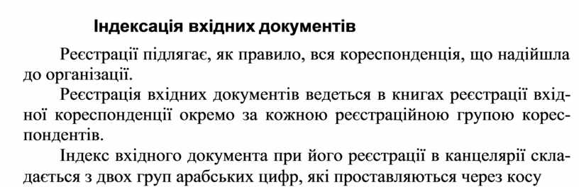 Індекс вхідного документа при його реєстрації в канцелярії скла- дається з двох груп арабських цифр, які проставляються через косу