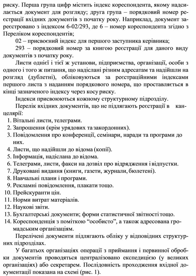 риску. Перша група цифр містить індекс кореспондента, якому надси- лається документ для розгляду; друга група – порядковий номер ре- єстрації вхідних документів з початку року. Наприклад, документ за- реєстровано з індексом 6-02/293, де 6 – номер кореспондента згідно з Переліком кореспондентів;