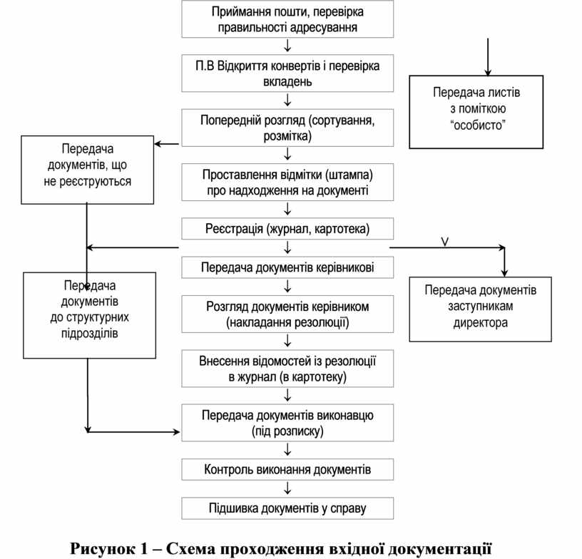 У багатьох організаціях операції з приймання і первинної оброб- ки документів проводяться централізовано експедицією (у великих організаціях) або секретарем. Послідовність проходження вхідної до- кументації показана на схемі (рис. 1).