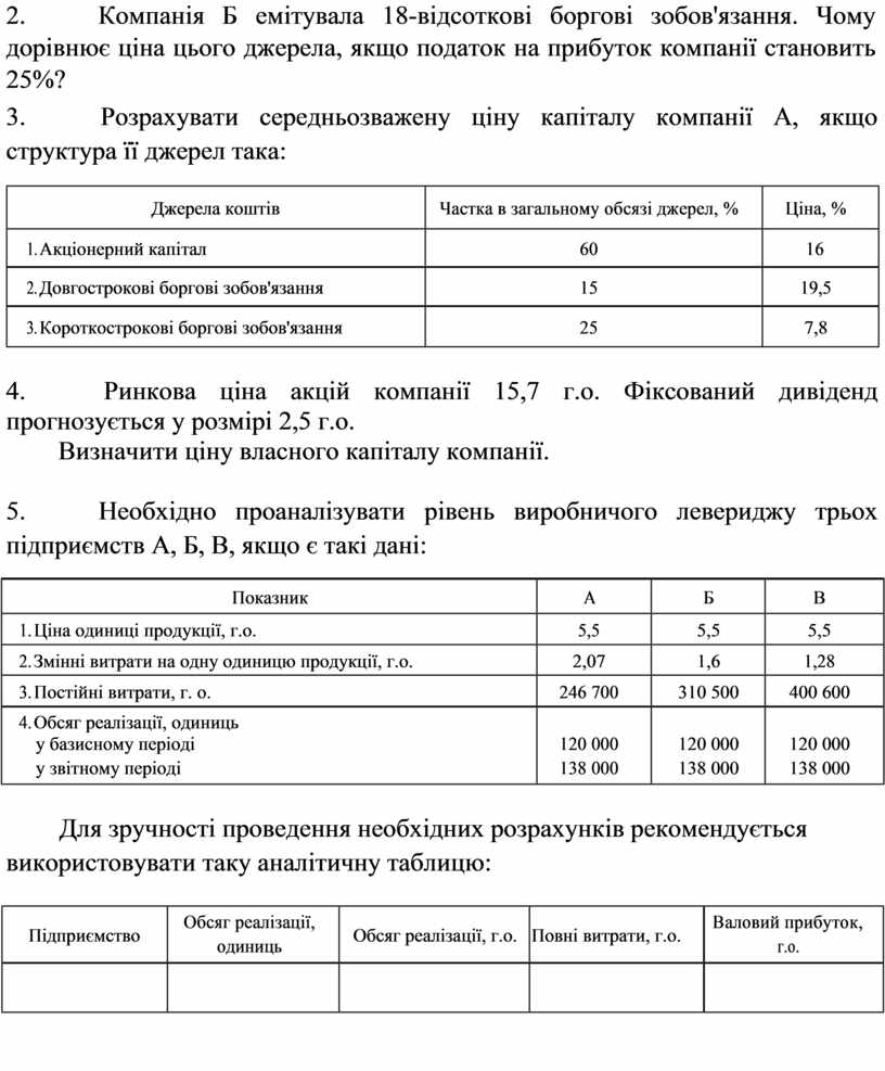 2. Компанія Б емітувала 18-відсоткові боргові зобов'язання. Чому дорівнює ціна цього джерела, якщо податок на прибуток компанії становить 25%?