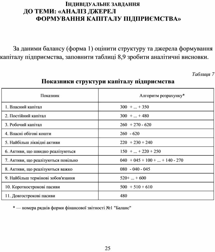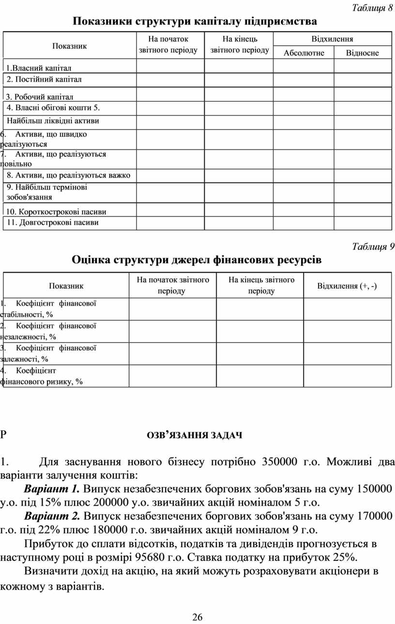 За даними балансу (форма 1) оцінити структуру та джерела формування капіталу підприємства, заповнити таблиці 8,9 зробити аналітичні висновки.