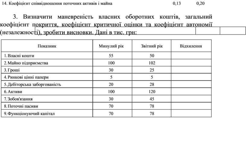 3. Визначити маневреність власних оборотних коштів, загальний коефіцієнт покриття, коефіцієнт критичної оцінки та коефіцієнт автономії (незалежності), зробити висновки. Дані в тис. грн: