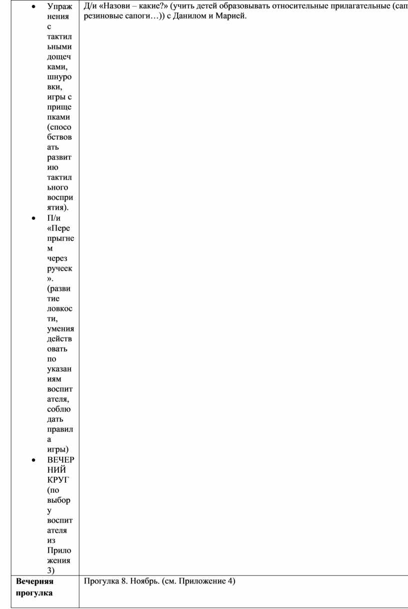 · Театральная деятельность. Театрализованная игра «Путешествие» (развивать умение детей фантазировать, придумывать различные истории). · СРИ «Погладим белье» (расширять представления детей об уходе и бережном отношении к одежде кукол. Поощрять самостоятельные попытки подбирать атрибуты и организовывать игровую обстановку). · ХБТ – стирка кукольной одежды (воспитывать желание поддерживать порядок в группе). · Упражнения с тактильными дощечками, шнуровки, игры с прищепками (способствовать развитию тактильного восприятия). · П/и «Перепрыгнем через ручеек». (развитие ловкости, умения действовать по указаниям воспитателя, соблюдать правила игры) · ВЕЧЕРНИЙ КРУГ (по выбору воспитателя из Приложения 3) |