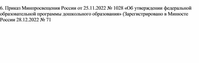 6. Приказ Минпросвещения России от 25.11.2022 № 1028 «Об утверждении федеральной образовательной программы дошкольного образования» (Зарегистрировано в Минюсте России 28.12.2022 № 71