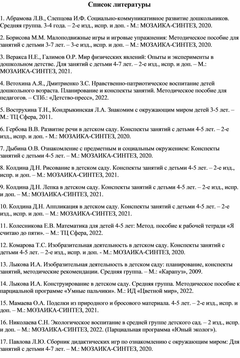 16. Николаева С.Н. Экологическое воспитание в средней группе детского сад. – 2 изд., испр. и доп. – М.: МОЗАИКА-СИНТЕЗ, 2022. (Парциальная программа «Юный эколог»).
