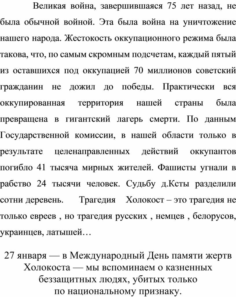 Великая война, завершившаяся 75 лет назад, не была обычной войной. Эта была война на уничтожение нашего народа. Жестокость оккупационного режима была такова, что, по самым скромным подсчетам, каждый пятый из оставшихся под оккупацией 70 миллионов советский гражданин не дожил до победы. Практически вся оккупированная территория нашей страны была превращена в гигантский лагерь смерти. По данным Государственной комиссии, в нашей области только в результате целенаправленных действий оккупантов погибло 41 тысяча мирных жителей. Фашисты угнали в рабство 24 тысячи человек. Судьбу д.Ксты разделили сотни деревень. Трагедия Холокост – это трагедия не только евреев , но трагедия русских , немцев , белорусов, украинцев, латышей…