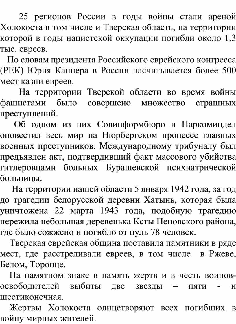 25 регионов России в годы войны стали ареной Холокоста в том числе и Тверская область, на территории которой в годы нацистской оккупации погибли около 1,3 тыс. евреев.