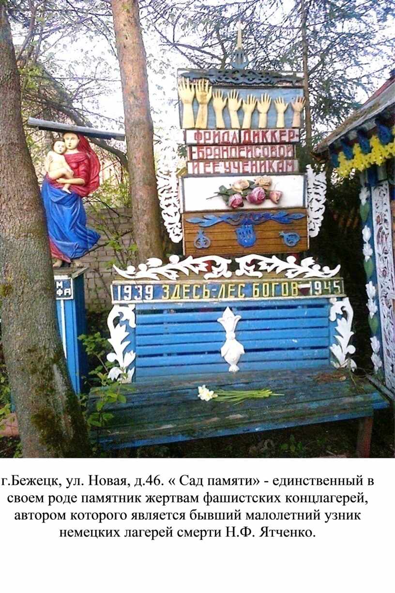 г.Бежецк, ул. Новая, д.46. « Сад памяти» - единственный в своем роде памятник жертвам фашистских концлагерей, автором которого является бывший малолетний узник немецких лагерей смерти Н.Ф. Ятченко.