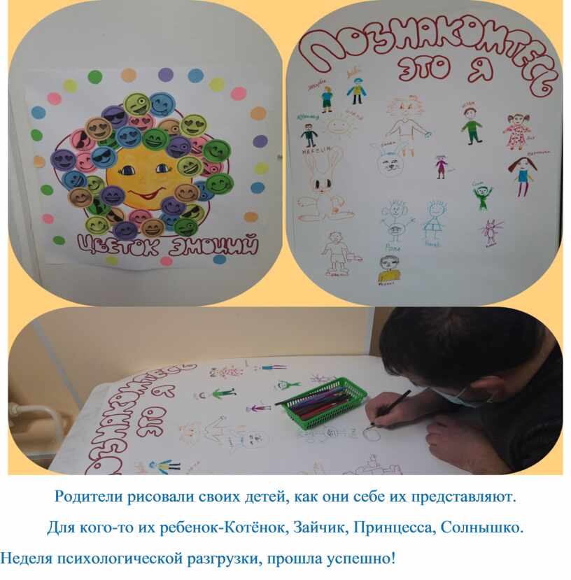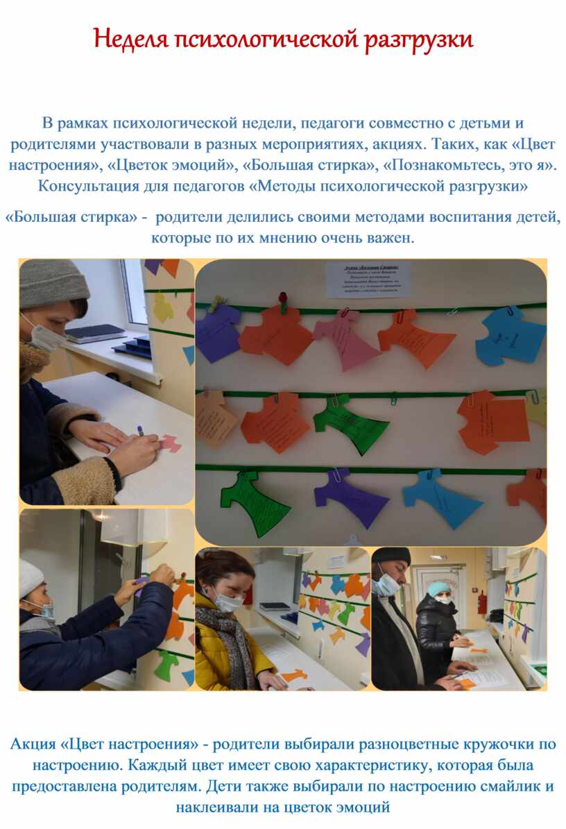 В рамках психологической недели, педагоги совместно с детьми и родителями участвовали в разных мероприятиях, акциях. Таких, как «Цвет настроения», «Цветок эмоций», «Большая стирка», «Познакомьтесь, это я». Консультация для педагогов «Методы психологической разгрузки»