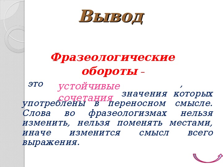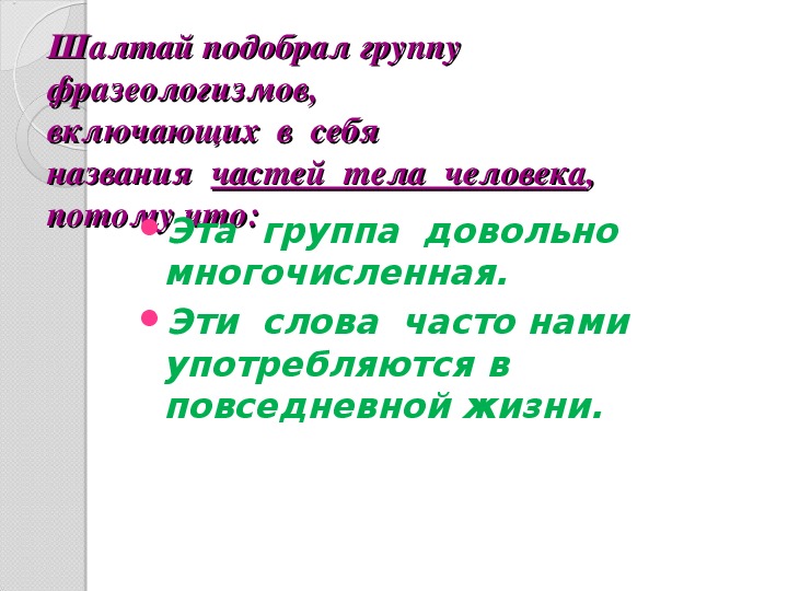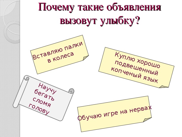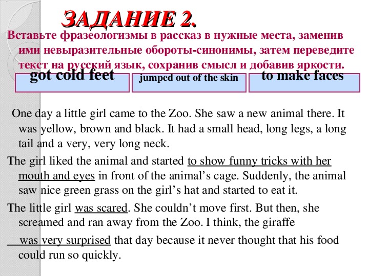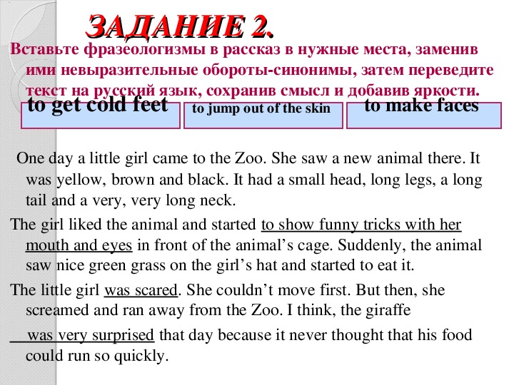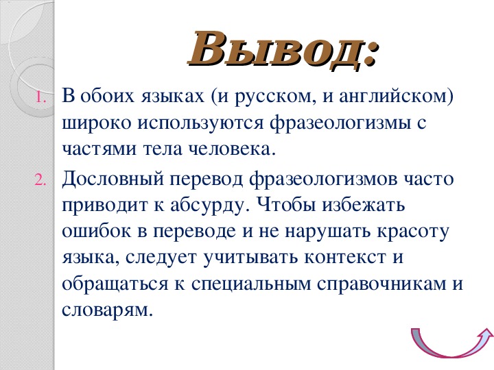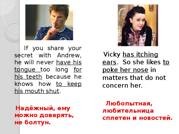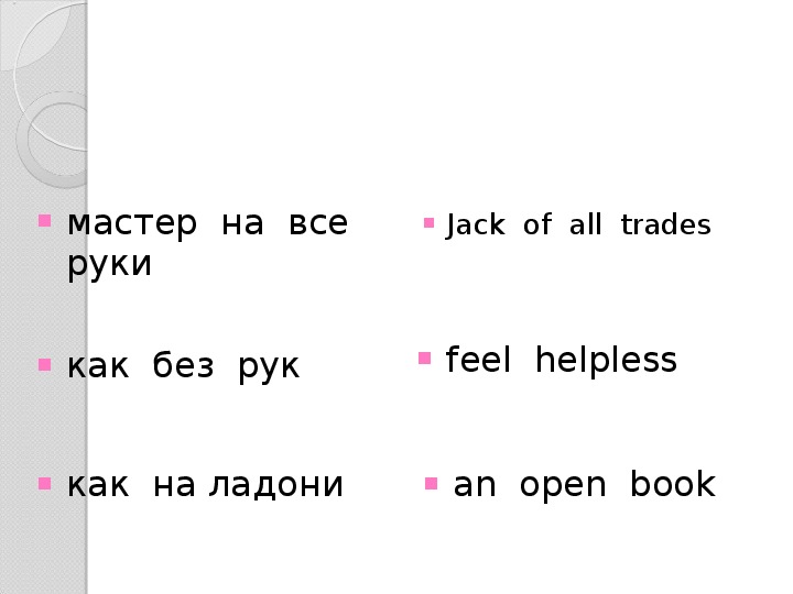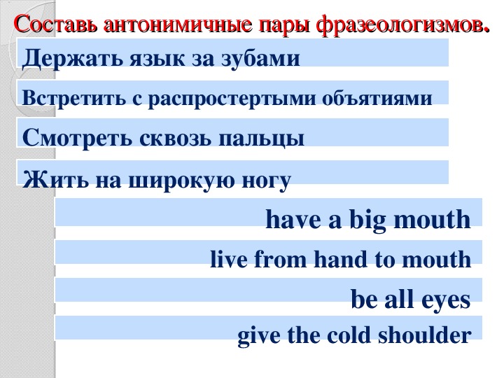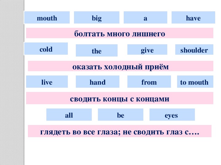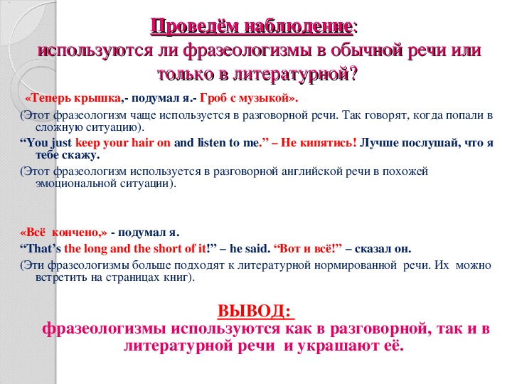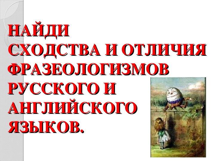 Приводятся примеры английских фразеологизмов и дается сравнение их с русскими идиомами и крылатыми выражениями. Предлагаются творческие задания для учащихся на знание фразеологизмов, на смекалку, креативный подход к выполнению конкурсных задач. Применяется игровая методика, увлекающая учеников в чудесный мир народной мудрости.Презентация по теме