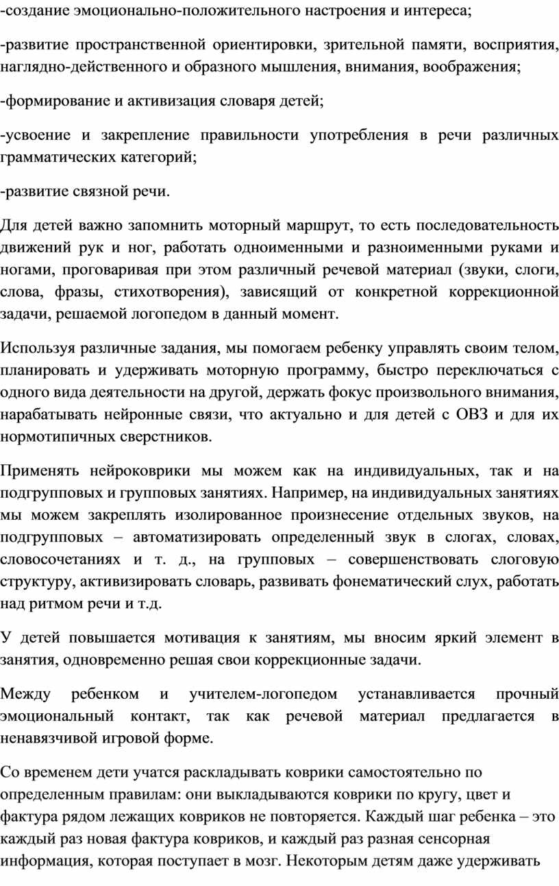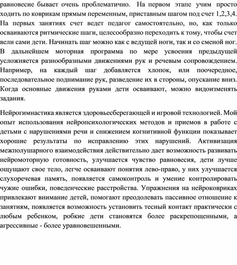 Нейрогимнастика является здоровьесберегающей и игровой технологией. Мой опыт использования нейропсихологических методов и приемов в работе с детьми с нарушениями речи и снижением когнитивной функции показывает хорошие результаты по исправлению этих нарушений. Активизация межполушарного взаимодействия действительно дает возможность развивать нейромоторную готовность, улучшается чувство равновесия, дети лучше ощущают свое тело, легче осваивают понятия лево-право, у них улучшается слухоречевая память, появляется самоконтроль и умение контролировать чужие ошибки, поведенческие расстройства. Упражнения на нейроковриках привлекают внимание детей, помогают преодолевать пассивное отношение к занятиям, появляется возможность установить тесный контакт практически с любым ребенком, робкие дети становятся более раскрепощенными, а агрессивные - более уравновешенными.