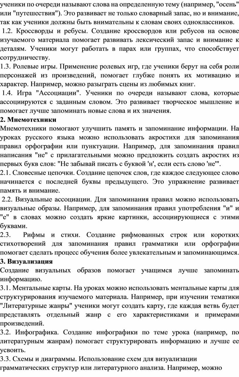 Эти методы и техники помогут создать более динамичную и интересную образовательную среду на уроках русского языка, способствуя развитию памяти, внимания и мышления учащихся.