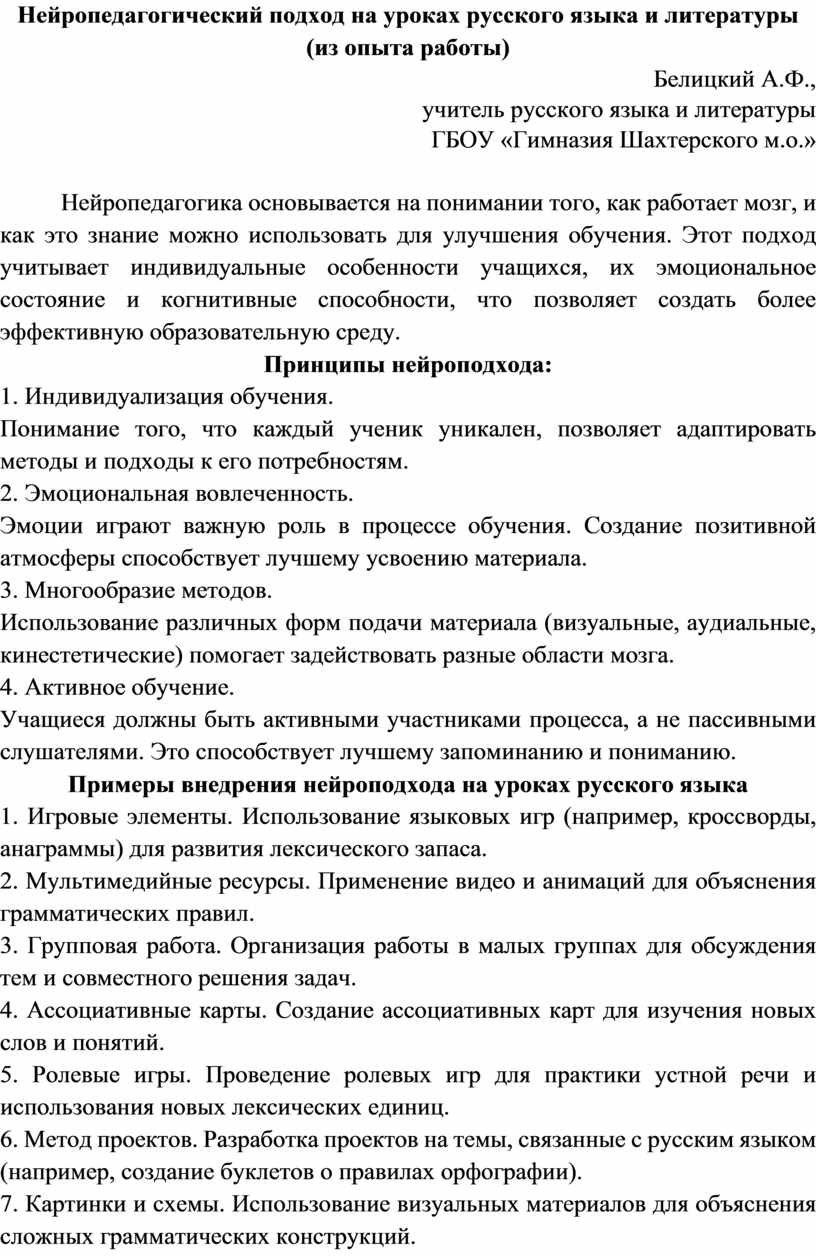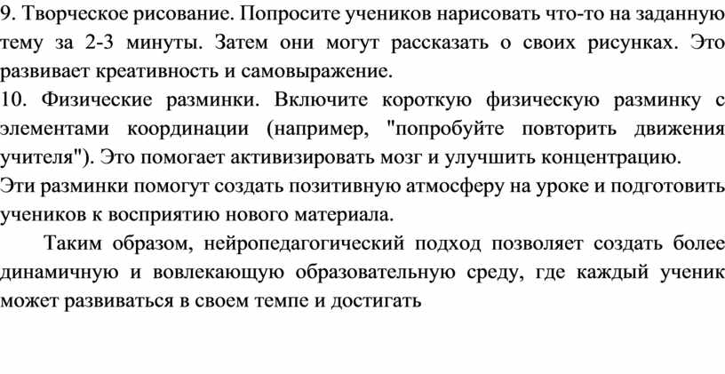 Таким образом, нейропедагогический подход позволяет создать более динамичную и вовлекающую образовательную среду, где каждый ученик может развиваться в своем темпе и достигать