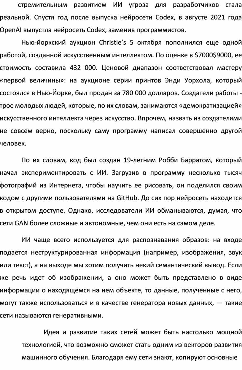 Нью-йоркский аукцион Christie’s 5 октября пополнился еще одной работой, созданной искусственным интеллектом. По оценке в $7000$9000, ее стоимость составила 432 000. Ценовой диапазон соответствовал мастеру «первой величины»: на аукционе серии принтов Энди Уорхола, который состоялся в Нью-Йорке, был продан за 780 000 долларов. Создатели работы - трое молодых людей, которые, по их словам, занимаются «демократизацией» искусственного интеллекта через искусство. Впрочем, назвать из создателями не совсем верно, поскольку саму программу написал совершенно другой человек.
