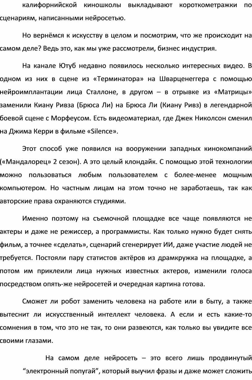 Именно поэтому на съемочной площадке все чаще появляются не актеры и даже не режиссер, а программисты. Как только нужно будет снять фильм, а точнее «сделать», сценарий сгенерирует ИИ, даже участие людей не требуется. Постояли пару статистов актёров из драмкружка на площадке, а потом им приклеили лица нужных известных актеров, изменили голоса посредством опять-же нейросетей и очередная картина готова.