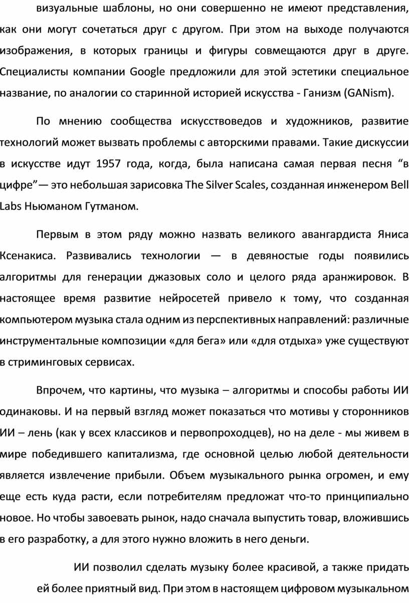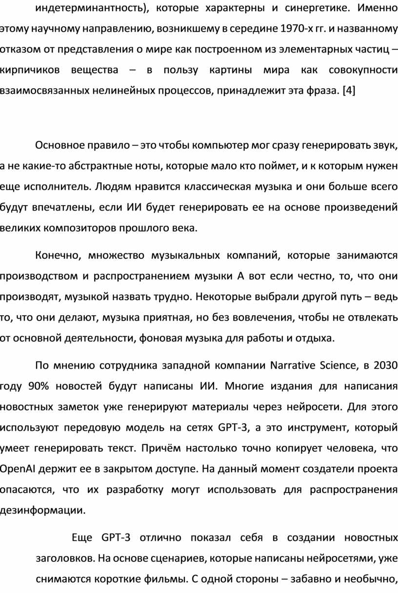ИИ позволил сделать музыку более красивой, а также придать ей более приятный вид. При этом в настоящем цифровом музыкальном искусстве есть такие качества (как нелинейность, открытость, равновесность, диссипация, индетерминантность), которые характерны и синергетике. Именно этому научному направлению, возникшему в середине 1970-х гг. и названному отказом от представления о мире как построенном из элементарных частиц – кирпичиков вещества – в пользу картины мира как совокупности взаимосвязанных нелинейных процессов, принадлежит эта фраза. [4]