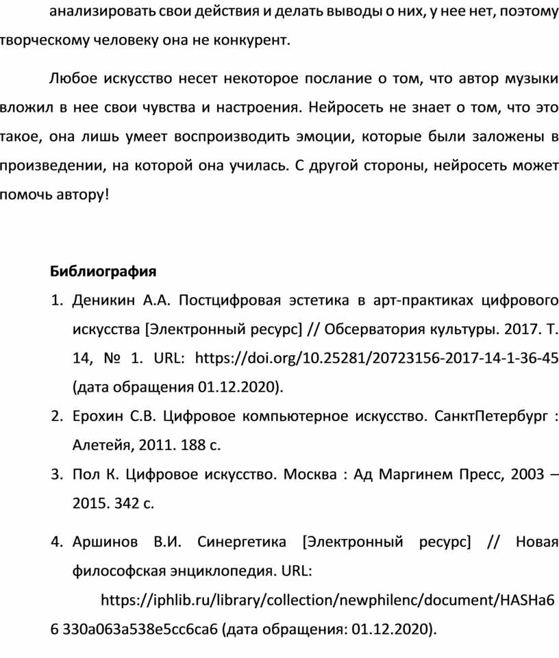 1. Деникин А.А. Постцифровая эстетика в арт-практиках цифрового искусства [Электронный ресурс] // Обсерватория культуры. 2017. Т. 14, № 1. URL: https://doi.org/10.25281/20723156-2017-14-1-36-45 (дата обращения 01.12.2020).