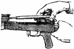 Присоединить возвратный механизм. Правой рукой ввести возвратный механизм в канал затворной рамы; сжимая возвратную пружину, подать направляющий стержень вперед и, опустив несколько книзу, ввести его пятку в продольный паз ствольной коробки.