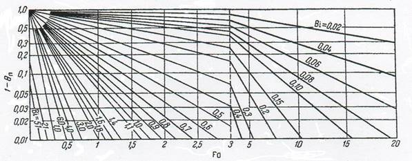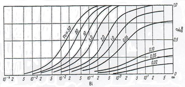тепловіддачі знаходять коефіцієнт α і розраховують критерій Bi. Із точки перетину горизонтальної лінії, що відповідає значенню 1-
