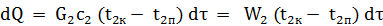 При масовій витраті охолоджувальної води G2 та ж кількість тепла dQ за рівнянням теплового балансу дорівнює: