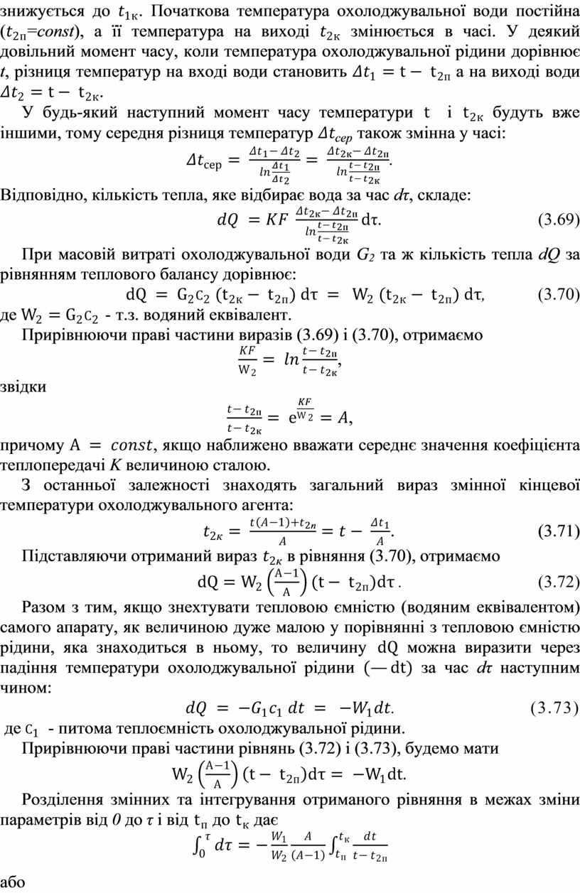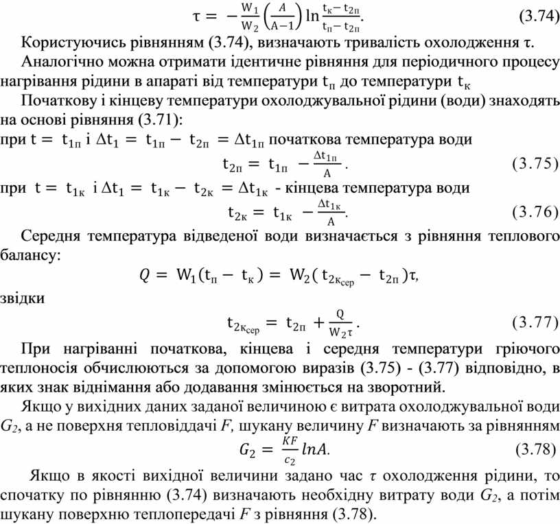 Якщо в якості вихідної величини задано час τ охолодження рідини, то спочатку по рівнянню (3.74) визначають необхідну витрату води G2, а потім шукану поверхню теплопередачі F з рівняння (3.78).