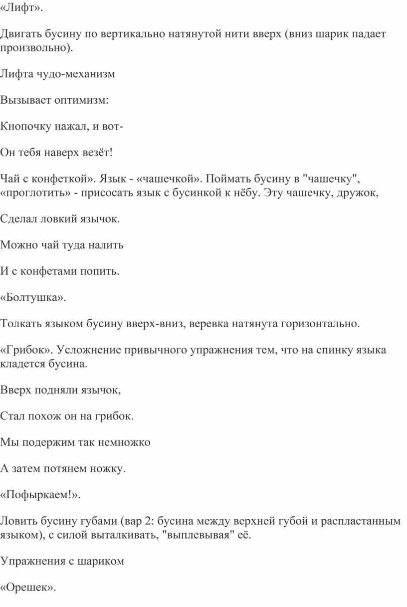 «Грибок». Усложнение привычного упражнения тем, что на спинку языка кладется бусина.