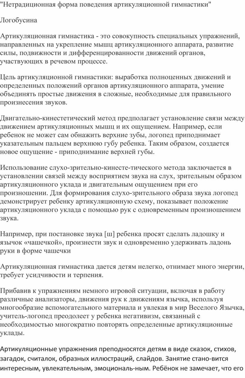 Прибавив к упражнениям немного игровой ситуации, включая в работу различные анализаторы, движения рук к движениям язычка, используя многообразие вспомогательного материала и увлекая в мир Веселого Язычка, учитель-логопед преодолеет у ребенка негативизм, связанный с необходимостью многократно повторять определенные артикуляционные уклады.