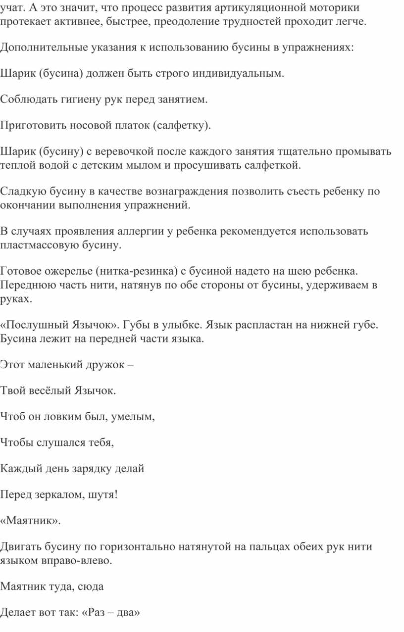 Сладкую бусину в качестве вознаграждения позволить съесть ребенку по окончании выполнения упражнений.