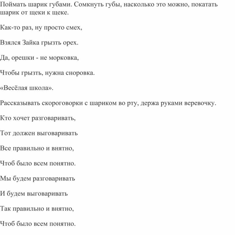 Рассказывать скороговорки с шариком во рту, держа руками веревочку.