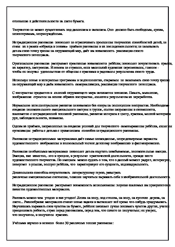 Изобразительная деятельность имеет неоценимое значение для всестороннего эстетического, нравственного, трудового и умственного развития детей. Она способствует формированию эмоционального восприятия искусства, эстетического отношения к действительности. Наблюдение и выделение свойств предметов, которые предстоит передать в изображении (формы, строение, величина, цвета, расположение в пространстве) способствует развитию у детей чувства формы, цвета, ритма - компонентов эстетического чувства.Данная работа посвящена выявлению и развитию детской художественной нетрадиционной одаренности средствами нетрадиционных техник изобразительного искусства.