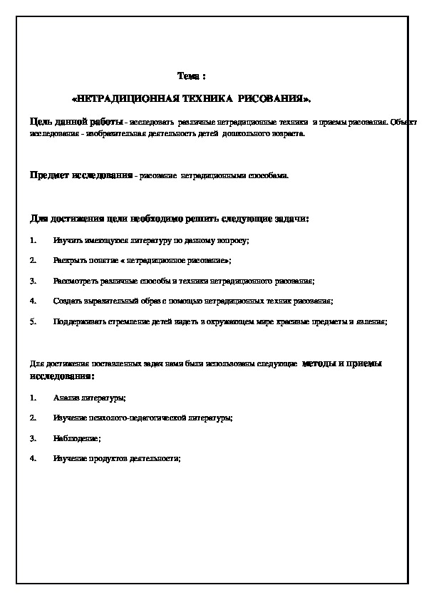 Цель данной работы исследовать различные нетрадиционные техники и приемы рисования. Объект