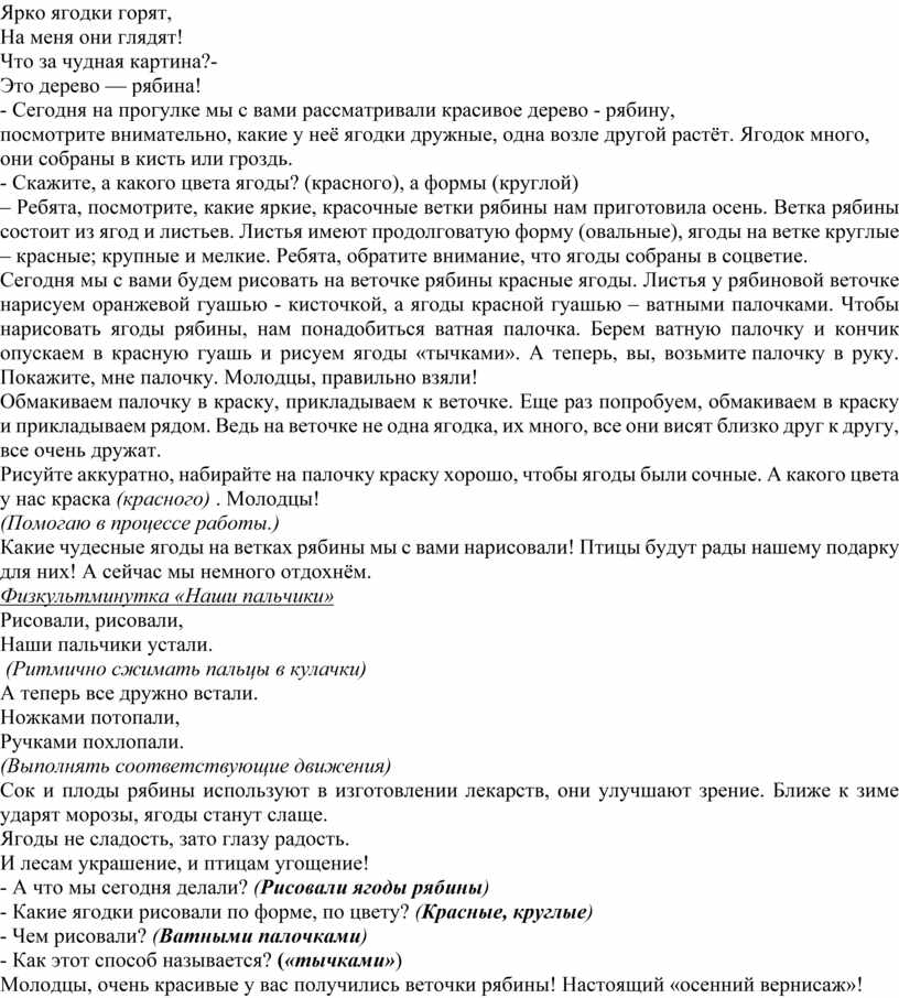Демонстрационный материал: натуральная ветка рябины с ягодами, картинки с изображением веточек рябины, образцы рисунков, гуашевые краски желтого, красного, оранжевого цвета, кисти, ватные палочки, вода в стаканчиках
