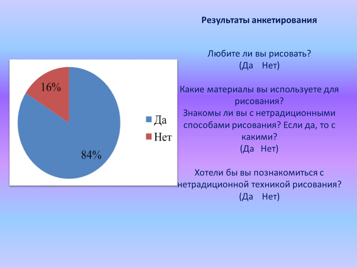 Результаты анкетированияЛюбите ли вы рисовать?(Да Нет)Какие материалы вы используете для рисования?Знакомы ли вы с нетрадиционными способами рисования? Если да, то с какими?(Да Нет)Хотели бы вы познакомиться с нетрадиционной техникой рисования?(Да Нет)