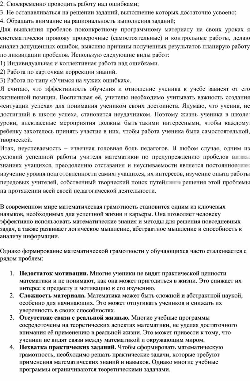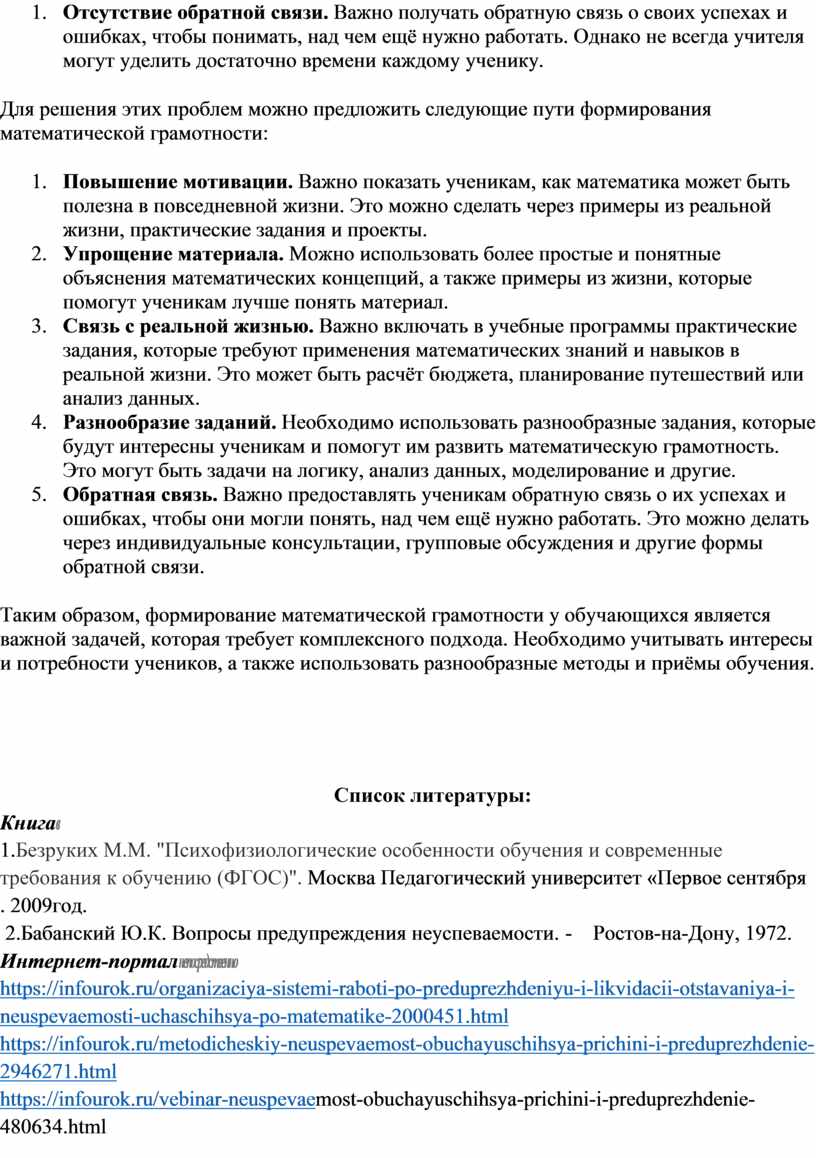 Таким образом, формирование математической грамотности у обучающихся является важной задачей, которая требует комплексного подхода. Необходимо учитывать интересы и потребности учеников, а также использовать разнообразные методы и приёмы обучения.