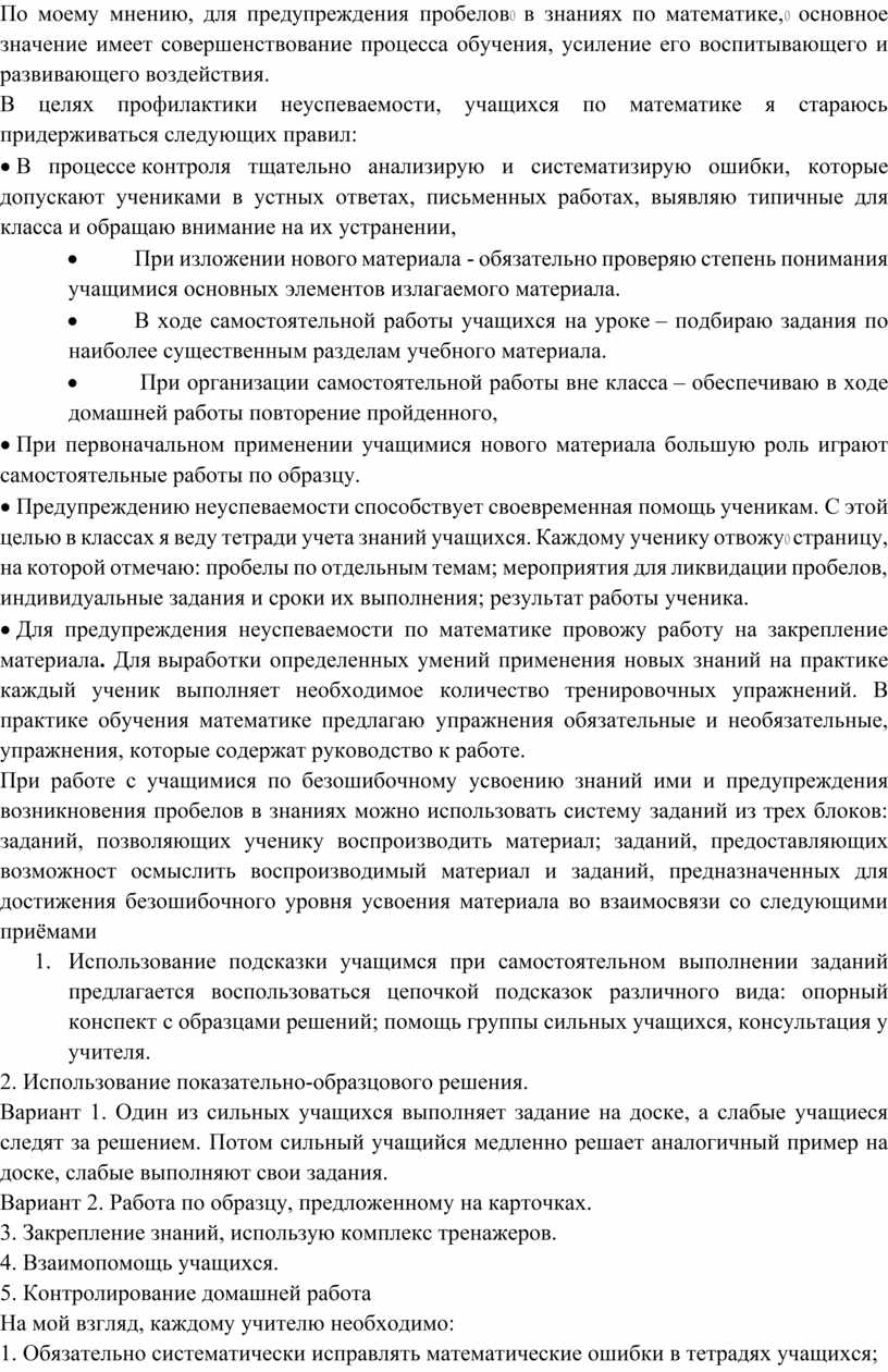 По моему мнению, для предупреждения пробелово в знаниях по математике, о основное значение имеет совершенствование процесса обучения, усиление его воспитывающего и развивающего воздействия.