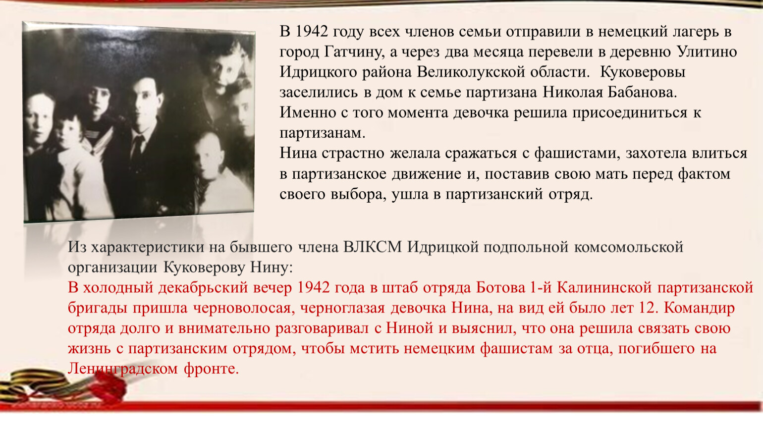 Из характеристики на бывшего члена ВЛКСМ Идрицкой подпольной комсомольской организации Куковерову Нину: