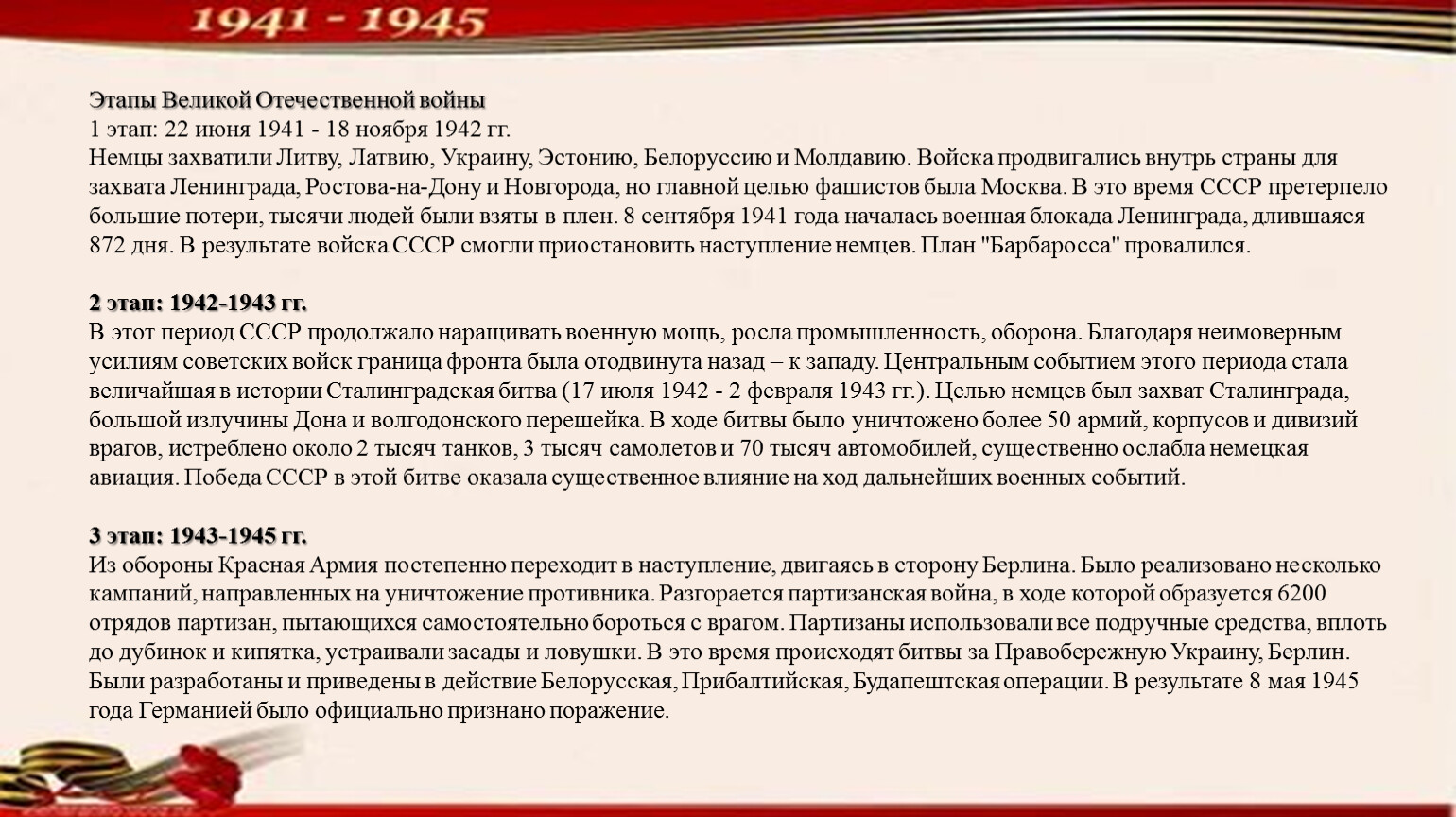 Этапы Великой Отечественной войны1 этап: 22 июня 1941 - 18 ноября 1942 гг.Немцы захватили Литву, Латвию, Украину, Эстонию, Белоруссию и Молдавию. Войска продвигались внутрь страны для захвата Ленинграда, Ростова-на-Дону и Новгорода, но главной целью фашистов была Москва. В это время СССР претерпело большие потери, тысячи людей были взяты в плен. 8 сентября 1941 года началась военная блокада Ленинграда, длившаяся 872 дня. В результате войска СССР смогли приостановить наступление немцев. План "Барбаросса" провалился.2 этап: 1942-1943 гг.В этот период СССР продолжало наращивать военную мощь, росла промышленность, оборона. Благодаря неимоверным усилиям советских войск граница фронта была отодвинута назад – к западу. Центральным событием этого периода стала величайшая в истории Сталинградская битва (17 июля 1942 - 2 февраля 1943 гг.). Целью немцев был захват Сталинграда, большой излучины Дона и волгодонского перешейка. В ходе битвы было уничтожено более 50 армий, корпусов и дивизий врагов, истреблено около 2 тысяч танков, 3 тысяч самолетов и 70 тысяч автомобилей, существенно ослабла немецкая авиация. Победа СССР в этой битве оказала существенное влияние на ход дальнейших военных событий.3 этап: 1943-1945 гг.Из обороны Красная Армия постепенно переходит в наступление, двигаясь в сторону Берлина. Было реализовано несколько кампаний, направленных на уничтожение противника. Разгорается партизанская война, в ходе которой образуется 6200 отрядов партизан, пытающихся самостоятельно бороться с врагом. Партизаны использовали все подручные средства, вплоть до дубинок и кипятка, устраивали засады и ловушки. В это время происходят битвы за Правобережную Украину, Берлин. Были разработаны и приведены в действие Белорусская, Прибалтийская, Будапештская операции. В результате 8 мая 1945 года Германией было официально признано поражение.