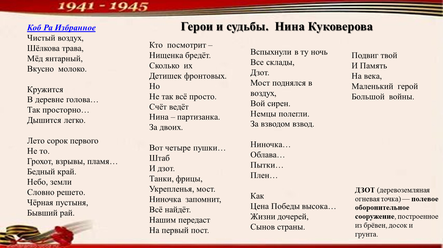 Вспыхнули в ту ночьВсе склады,Дзот.Мост поднялся в воздух,Вой сирен.Немцы полегли.За взводом взвод.Ниночка…Облава…Пытки…Плен…КакЦена Победы высока…Жизни дочерей,Сынов страны.