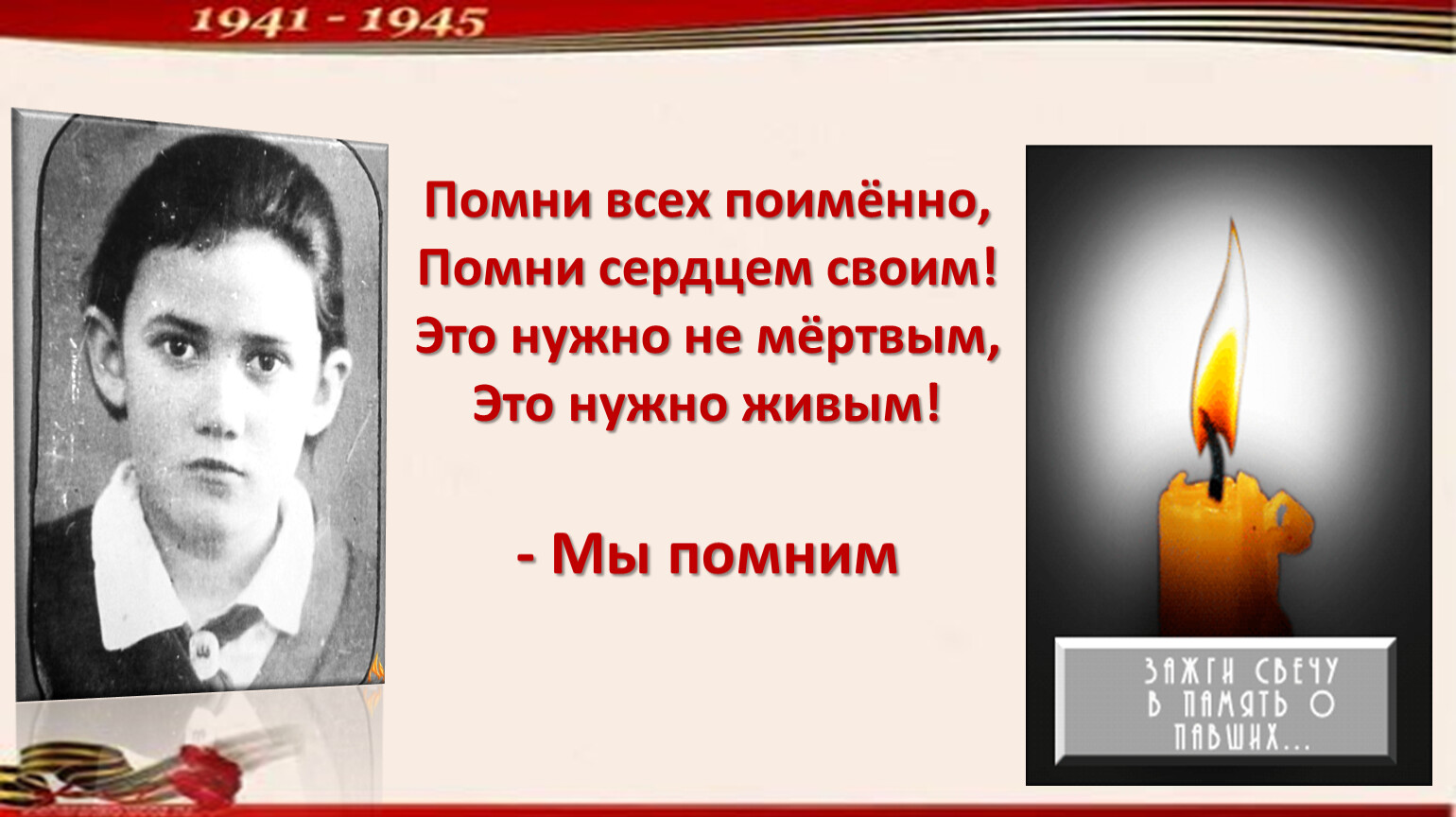 Подвиг твойИ ПамятьНа века,Маленький геройБольшой войны.