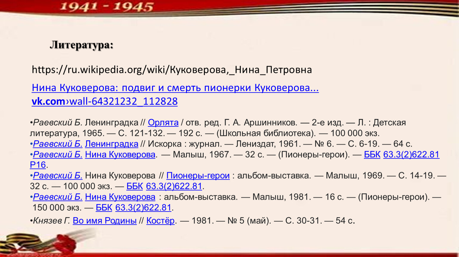 Раевский Б. Нина Куковерова : альбом-выставка. — Малыш, 1981. — 16 с. — (Пионеры-герои). — 150 000 экз. — ББК 63.3(2)622.81.