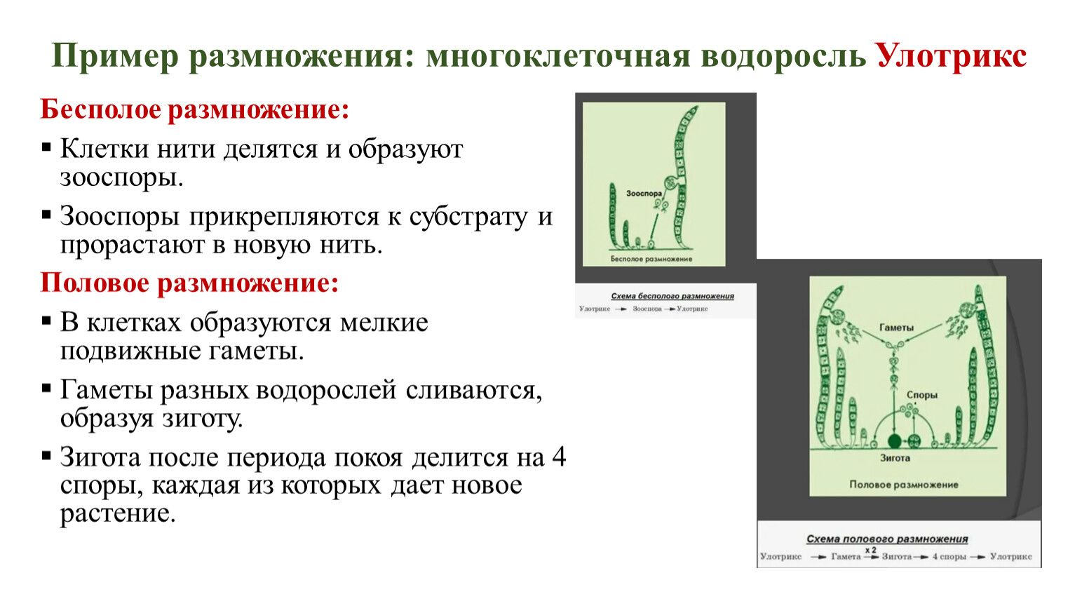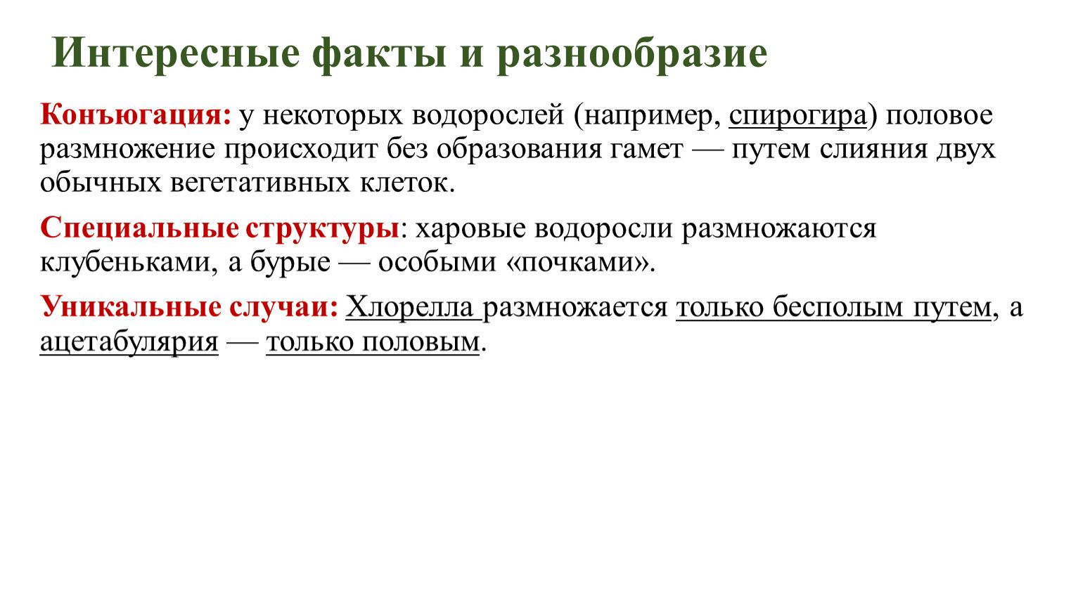 Уникальные случаи: Хлорелла размножается только бесполым путем, а ацетабулярия — только половым.