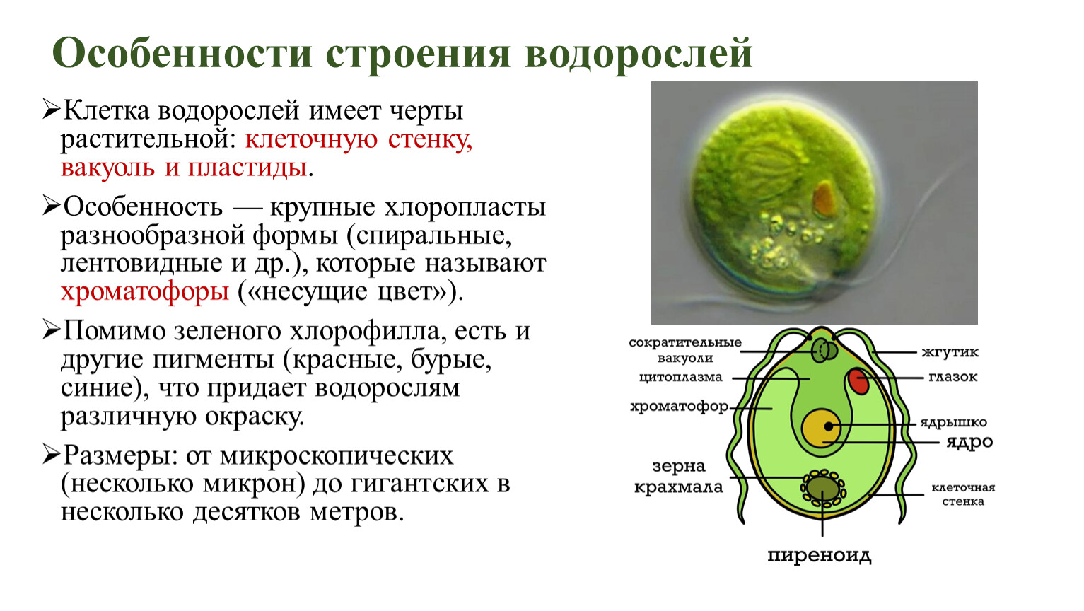 Клетка водорослей имеет черты растительной: клеточную стенку, вакуоль и пластиды.