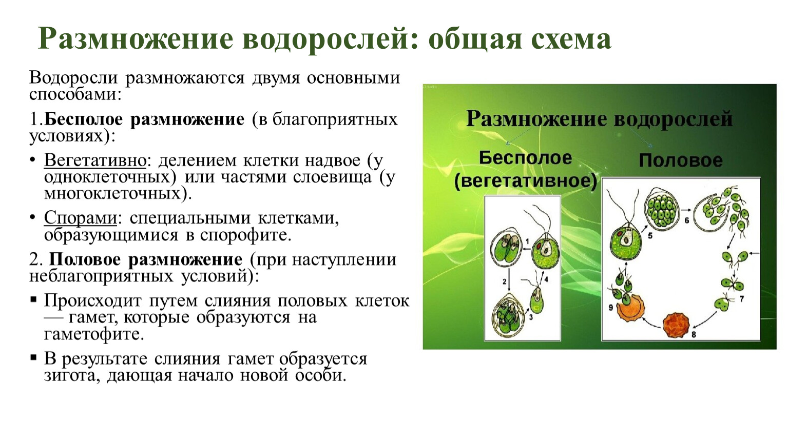 Конъюгация: у некоторых водорослей (например, спирогира) половое размножение происходит без образования гамет — путем слияния двух обычных вегетативных клеток.