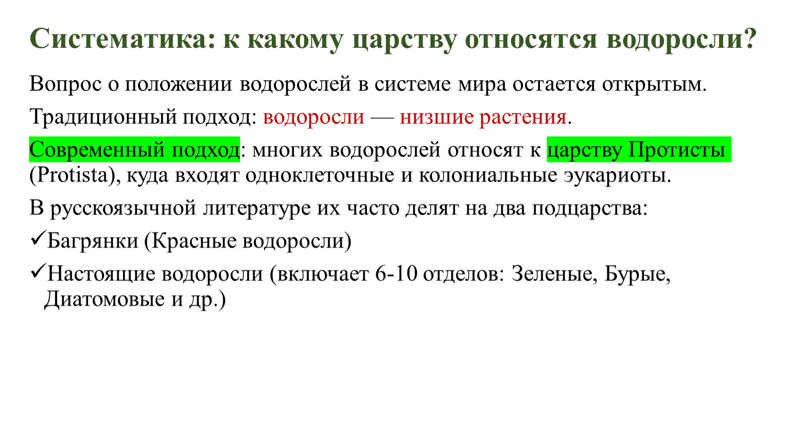 Современный подход: многих водорослей относят к царству Протисты (Protista), куда входят одноклеточные и колониальные эукариоты.