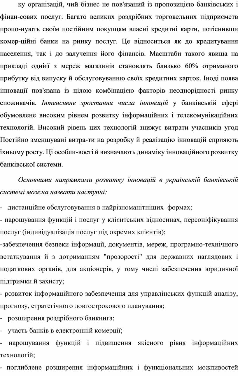 Звідси бідніший набір використовуваних фінансових інструментів, більш повільне освоєння нових продуктів і ін. Основна маса банківських інновацій націлена на міжкорпоративний сегмент ринку. Це пов'язане з великим обсягом угод, швидкістю впровадження, информированностью учасників ринку, неоднорідністю клієнтів, що є передумовою появи нових пропозицій. Відзначається посилення конкуренції для банківської сфери з бо-ку організацій, чий бізнес не пов'язаний із пропозицією банківських і фінан-сових послуг. Багато великих роздрібних торговельних підприємств пропо-нують своїм постійним покупцям власні кредитні карти, потіснивши комер-ційні банки на ринку послуг. Це відноситься як до кредитування населення, так і до залучення його фінансів. Масштаби такого явища на прикладі однієї з мереж магазинів становлять близько 60% отриманого прибутку від випуску й обслуговуванню своїх кредитних карток. Іноді поява інновації пов'язана із цілою комбінацією факторів неоднорідності ринку споживачів. Інтенсивне зростання числа інновацій у банківській сфері обумовлене високим рівнем розвитку інформаційних і телекомунікаційних технологій. Високий рівень цих технологій знижує витрати учасників угод Постійно зменшувані витра-ти на розробку й реалізацію інновацій сприяють їхньому росту. Ці особли-вості й визначають динаміку інноваційного розвитку банківської системи.