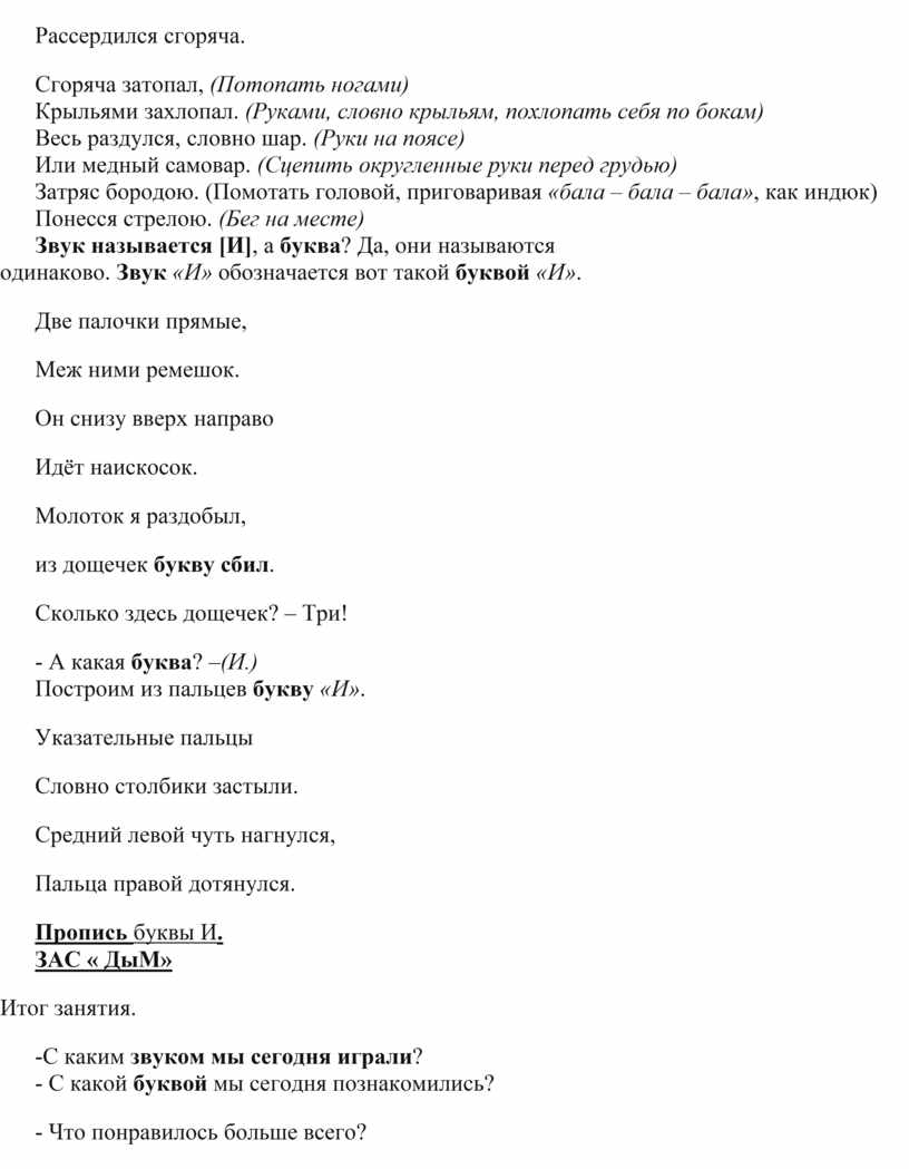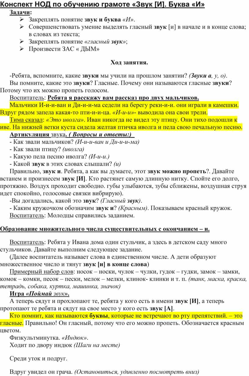 Конспект НОД по обучению грамоте «Звук [И]. Буква «И»
